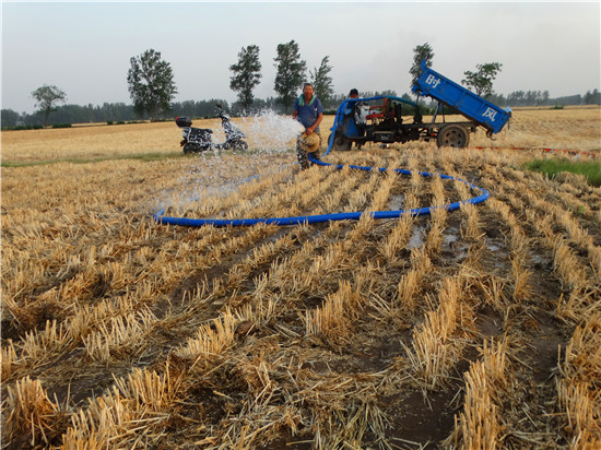 6月6日,沈丘縣周營鎮(zhèn)農(nóng)民正忙著抗旱“造墑”、“補(bǔ)墑”澆水,期待奪取秋糧豐收。 近期來,由于連續(xù)多日高溫?zé)o雨,土壤墑情差,無法播種秋作物。針對當(dāng)下嚴(yán)重的旱情,沈丘縣掀起“雙抗旱”(抗旱保苗、抗旱種秋)高潮。目前,該縣日出動勞力1.8萬余人,出動各類噴灌機(jī)械26000多臺(套),力保農(nóng)田播種的玉米出苗。