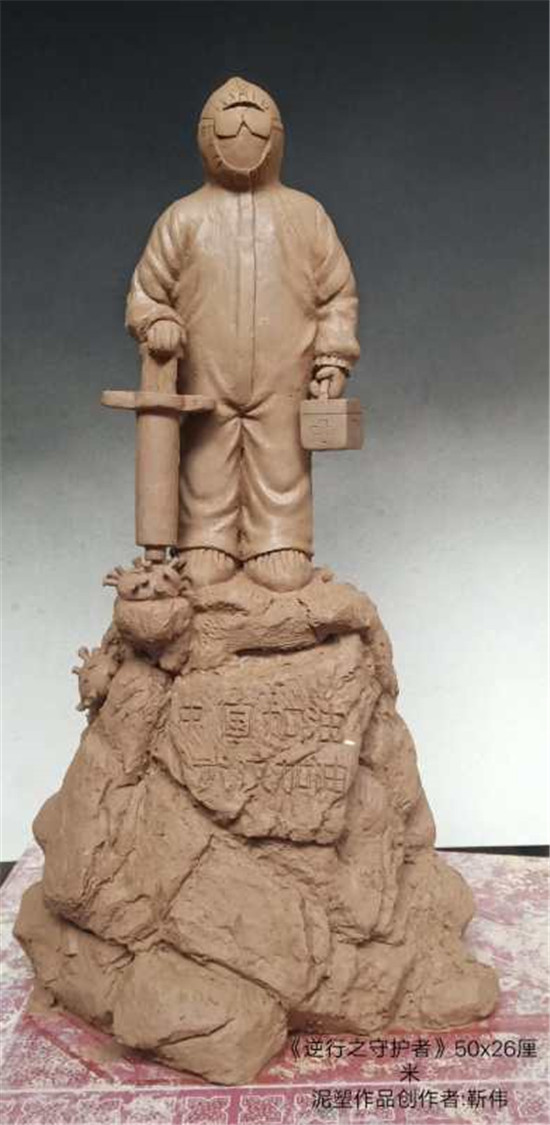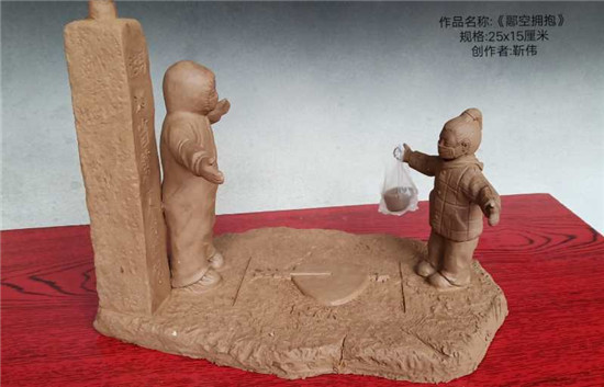 所捐《逆行之守護(hù)者》泥塑作品,高50厘米,寬26厘米,描述全副武裝的醫(yī)護(hù)工作者一手握針管殺死病毒,一手提藥箱救人,謳歌了疫情中逆行的醫(yī)護(hù)工作者不畏犧牲、與新冠病毒搏斗,冒死救治病毒感染者的偉大精神?!陡艨論肀А肥侵v述我市扶溝縣人民醫(yī)院抗疫故事,疫情期間奮戰(zhàn)在抗疫一線的劉海燕醫(yī)生和為自己送年夜飯的女孩隔空擁抱的感人場(chǎng)景,讓無數(shù)人熱淚盈眶。