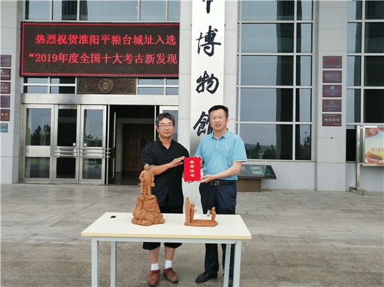6月12日,在2020年“文化和自然遺產(chǎn)日”即將來臨之際,淮陽區(qū)市級(jí)非物質(zhì)文化傳承人靳偉向市博物館捐贈(zèng)“抗疫”泥塑作品《逆行之守護(hù)者》《隔空擁抱》,以表達(dá)藝術(shù)家對(duì)新冠肺炎疫情期間全國醫(yī)務(wù)人員無私精神的敬意。周建山館長向靳偉頒發(fā)榮譽(yù)證書。