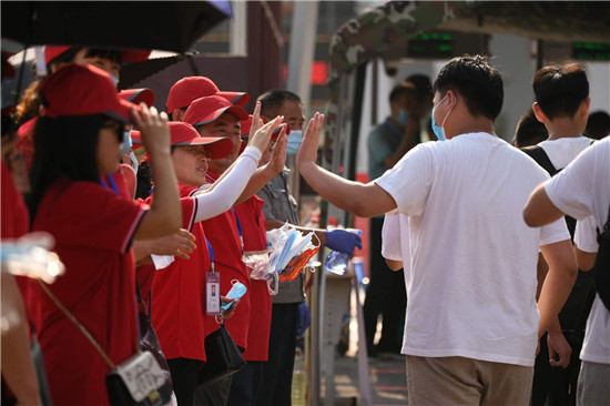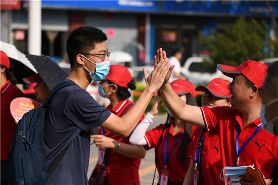 祝愿學(xué)子們考出好成績,今夏實(shí)現(xiàn)金榜題名,是全社會(huì)共同的心聲。7月7日上午8點(diǎn)多,2020年高考開啟神圣時(shí)刻,和往年不同的是,因疫情影響,學(xué)子們帶著口罩入場,作為外援的家長們,更是悉數(shù)趕到考場外,為孩子們加油!而辛勤一年的老師們,更顧不上歇一會(huì)兒,也趕到考場外,為學(xué)生擊掌打氣,構(gòu)成周口考場外動(dòng)人的圖景。圖為市一高考場外的家長們舉著加油的牌子,為孩子助威!一高的老師穿上小紅馬甲,當(dāng)志愿者,和進(jìn)場的學(xué)生擊掌助威!