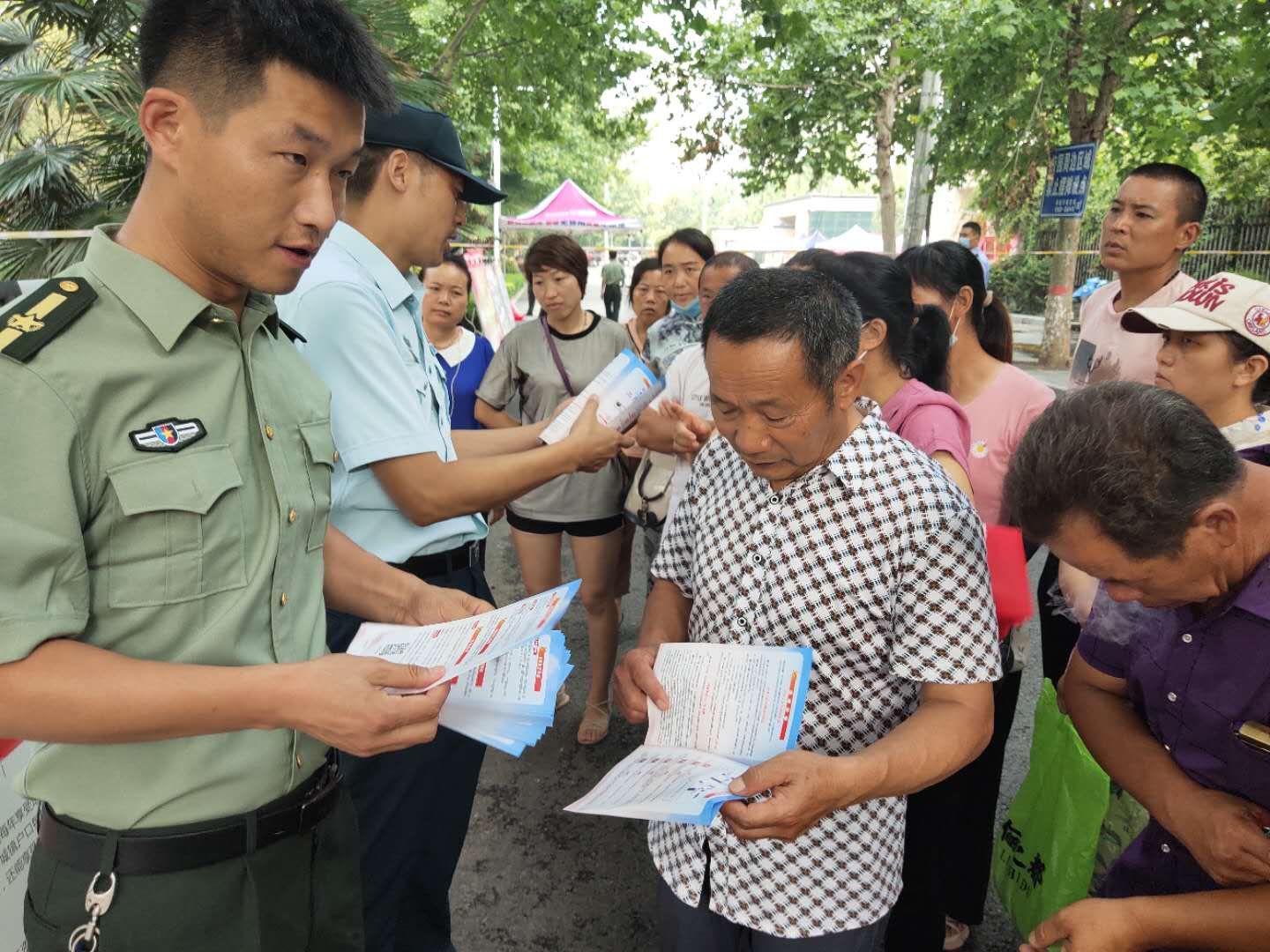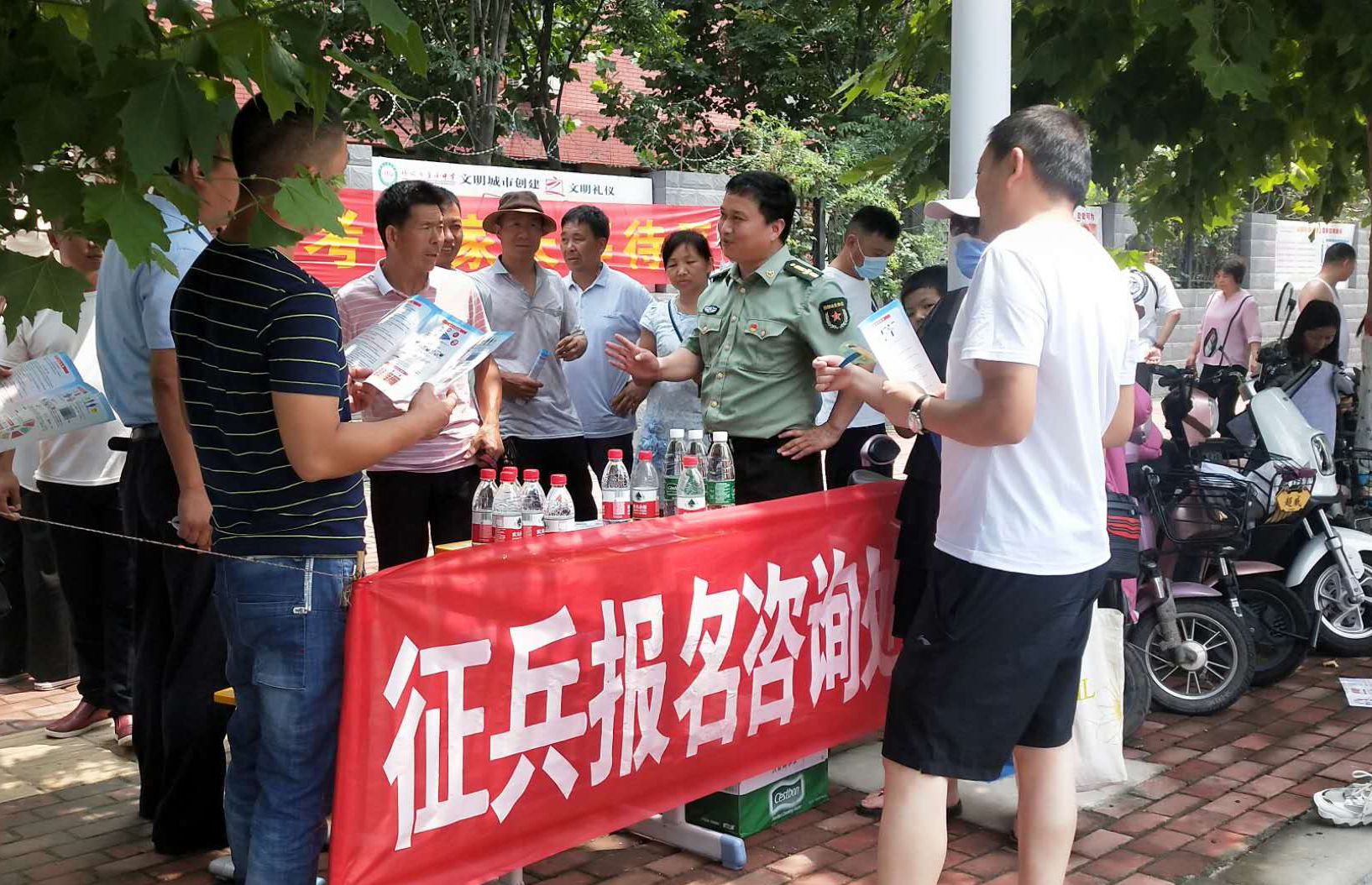 為強(qiáng)化全民依法履行兵役義務(wù)觀念,激發(fā)廣大適齡青年特別是高學(xué)歷青年參軍入伍熱情,7月7日至8日,項(xiàng)城市人武部組織機(jī)關(guān)所有人員和21個(gè)鎮(zhèn)(街道)辦事處武裝部長等36人,深入各考點(diǎn)設(shè)立征兵政策咨詢點(diǎn),懸掛宣傳標(biāo)語、擺放宣傳版面,開展以助力高考為目的的大學(xué)生征兵宣傳活動。為不影響考場秩序避免打擾高考,7月7日全天,參加宣傳的工作人員悄悄走進(jìn)家長等待區(qū),現(xiàn)場向廣大考生家長以及過往群眾發(fā)放《應(yīng)征入伍明白卡》、《大學(xué)生入伍優(yōu)惠政策》等征兵宣傳資料,并接受咨詢。7月8日下午5點(diǎn)30分后,為期兩天的高考結(jié)束后考生放松的走出考場大門之際,所有人員同時(shí)守在大門外,一邊給考生發(fā)放宣傳資料,一邊接受學(xué)生咨詢和報(bào)名,給他們講解大學(xué)生入伍政策、法規(guī),介紹“應(yīng)征入伍的政治、文化、身體和年齡條件”、“報(bào)名程序”、“就業(yè)安置”等相關(guān)內(nèi)容,鼓勵(lì)高中畢業(yè)生帶著成績和文化知識投身軍營、報(bào)效祖國。