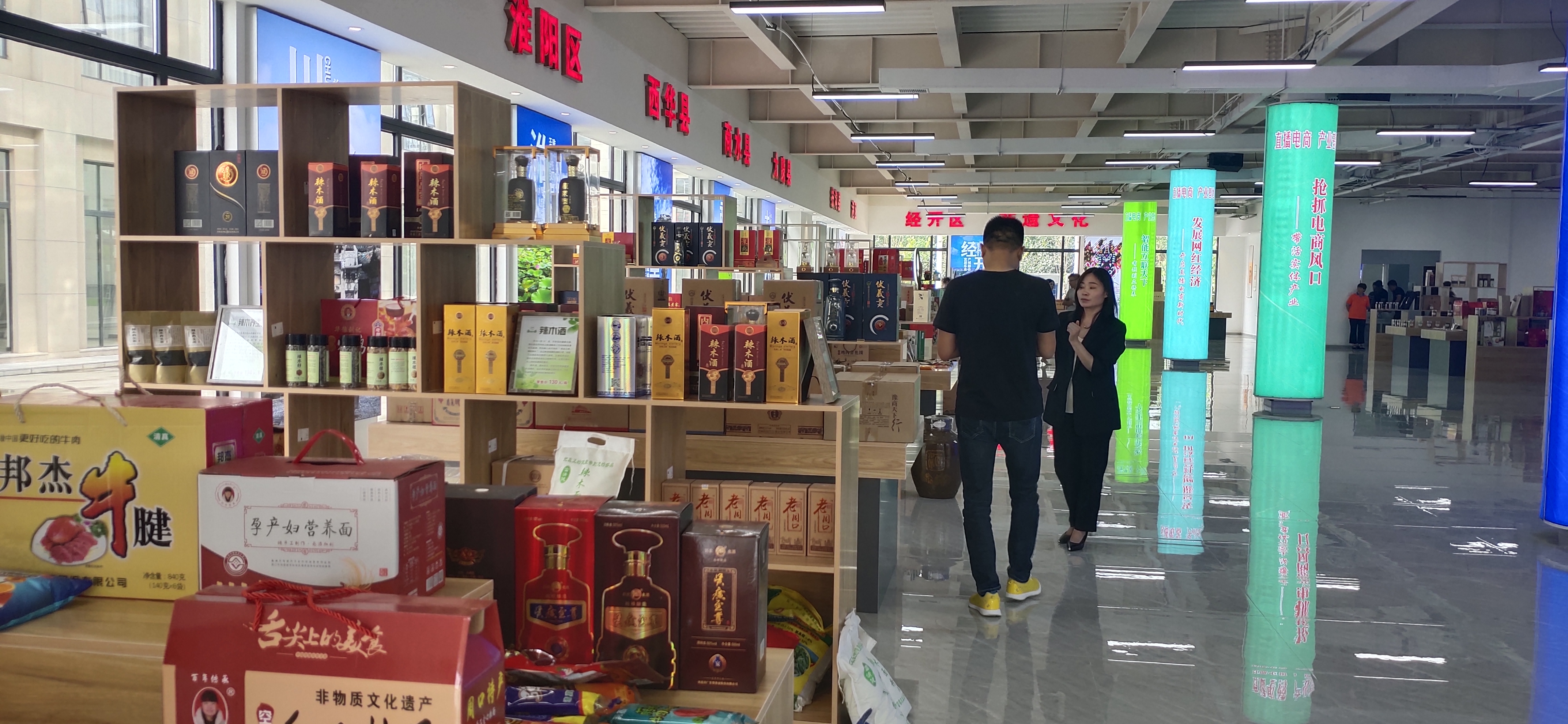 中心展廳面積達1000多平方米,按照不同縣(市、區(qū))劃分為十幾個區(qū)域,集中展示邦杰牛肉、伏羲貢酒、鄧城豬蹄、汝陽劉毛筆、三川豫龍復(fù)合肥等周口產(chǎn)品。這些產(chǎn)品都是來自各縣(市、區(qū))等地農(nóng)工副土特產(chǎn)品以及非遺產(chǎn)品?!拔覀儗⑼ㄟ^抖音、快手等視頻平臺,把這些產(chǎn)品銷往全國各地?!?該基地負責人、周口東方會展商會會長于海崗說。