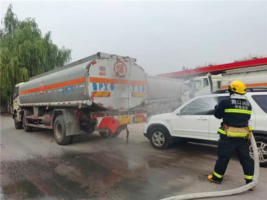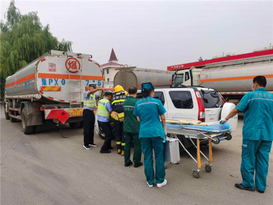 當日上午10時,商水交警大隊指揮中心接到報警:在商水縣興商大道與陳勝大道交叉口西、湯莊油庫處,一輛轎車與一輛危化品罐車追尾相撞,正常罐體損壞,?;沸孤镀鸹穑I車駕駛室變形,駕駛?cè)吮焕к噧?nèi),如不及時救援,駕駛?cè)擞猩kU,另外因事故現(xiàn)場臨近湯莊油庫,如不及時處置可能發(fā)生爆炸,后果不堪設(shè)想。
