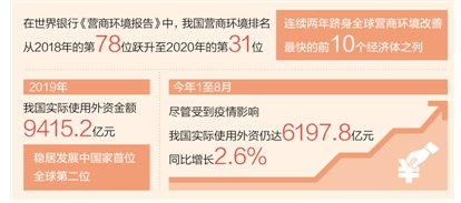 “十三五”期間,我國(guó)持續(xù)深化體制機(jī)制改革,全方位擴(kuò)大對(duì)外開(kāi)放,降低準(zhǔn)入門(mén)檻,提升服務(wù)質(zhì)量。在世界銀行《營(yíng)商環(huán)境報(bào)告》中,我國(guó)營(yíng)商環(huán)境排名從2018年的第78位躍升至2020年的第31位,連續(xù)兩年躋身全球營(yíng)商環(huán)境改善最快的前10個(gè)經(jīng)濟(jì)體之列。