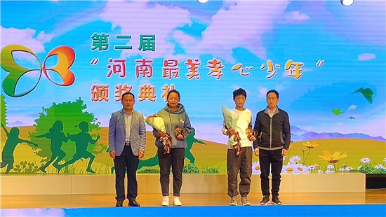 10月20日,河南省第二屆“河南最美孝心少年”頒獎(jiǎng)典禮在河南省實(shí)驗(yàn)學(xué)校鄭東小學(xué)舉行,全省表彰10名“河南最美孝心少年”,分別頒發(fā)獎(jiǎng)杯、證書(shū)和1萬(wàn)元獎(jiǎng)勵(lì)。省教育廳副廳長(zhǎng)毛杰等領(lǐng)導(dǎo)為孝心少年頒獎(jiǎng)并合影留念。鄲城縣汲水二中學(xué)生薛勝楠光榮受獎(jiǎng)。