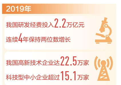 科技創(chuàng)新助推高質(zhì)量發(fā)展,我國創(chuàng)新型經(jīng)濟格局初步形成。截至2019年,全國高新技術(shù)企業(yè)達(dá)到22.5萬家,科技型中小企業(yè)超過15.1萬家。作為培育高新技術(shù)產(chǎn)業(yè)的重要載體,高新區(qū)5年來量質(zhì)同步提升。2019年,169家國家高新區(qū)生產(chǎn)總值達(dá)12萬億元,經(jīng)濟總量占全國的1/10以上。