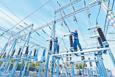 10月12日,甘肅省張掖市臨澤縣清潔能源供暖供電電網(wǎng)配套工程建設(shè)現(xiàn)場(chǎng),工作人員正在電塔上進(jìn)行最后的設(shè)備安裝調(diào)試?! ⊥?將攝(人民視覺) |