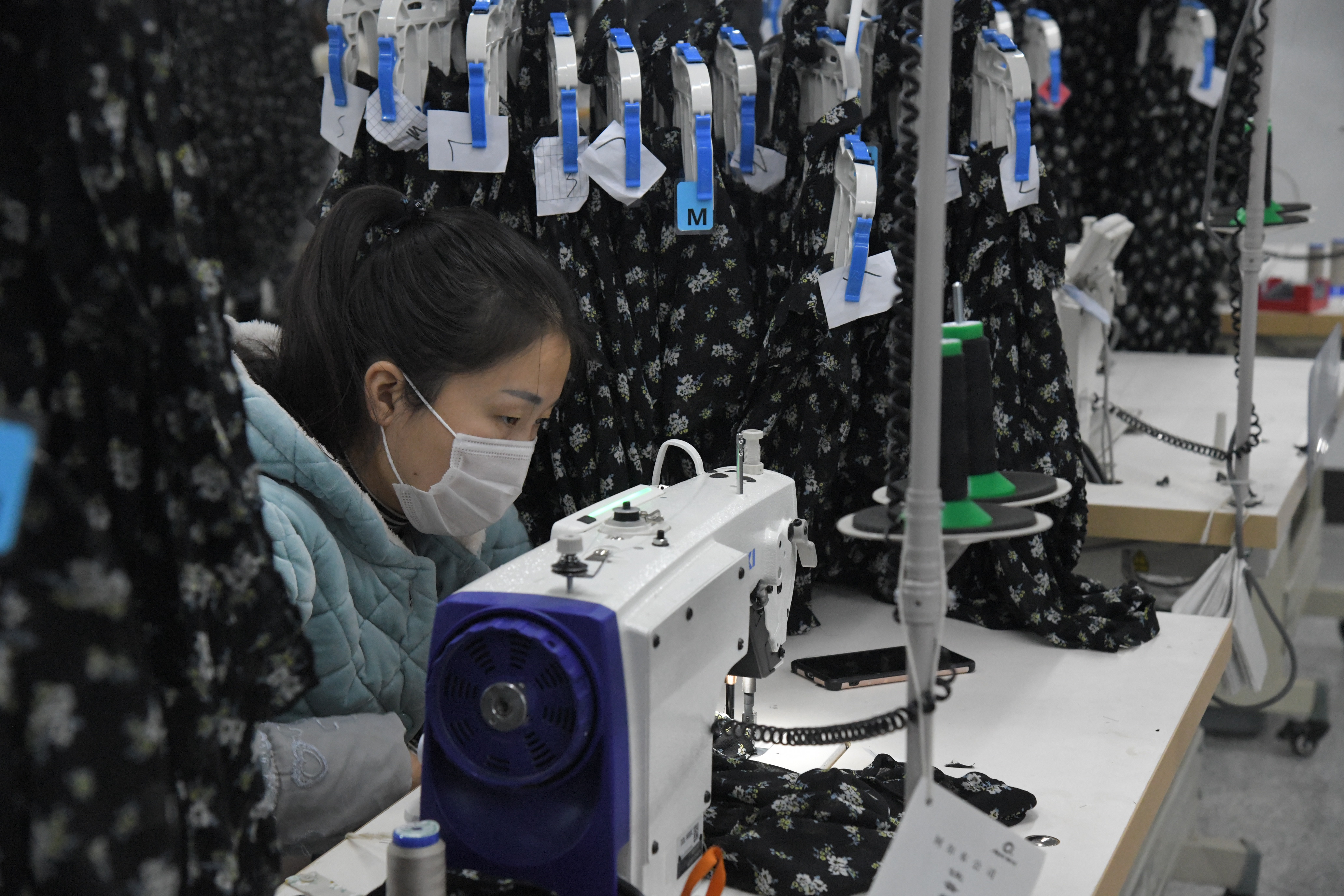 12月17日,在商水縣產(chǎn)業(yè)集聚區(qū)雅戈爾盛泰紡織工業(yè)園一現(xiàn)代化車間內(nèi),紡織女工正在制作外貿(mào)訂單服裝。雅戈爾盛泰紡織工業(yè)園是周口市重點招商引資企業(yè),總投資48億元,占地2000畝,是集棉紡、面料、印染、成衣、進出口貿(mào)易、跨國經(jīng)營于一體的大型綜合生產(chǎn)基地,長期代加工雅戈爾、PVH等國際品牌。該項目一期已經(jīng)投產(chǎn),全部建成后將填補我市紡織服裝行業(yè)缺少高端品牌的空白,促進我市輕紡工業(yè)的發(fā)展。