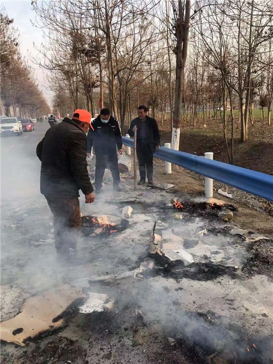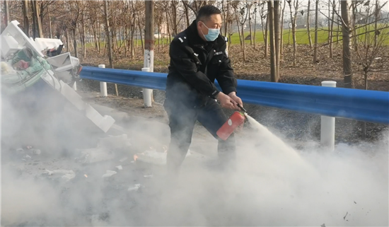 當(dāng)日下午4點左右,太康縣交警大隊二中隊指導(dǎo)員南應(yīng)開及輔警郭旗全、魯?shù)?、尹晨豪正在趙堂村附近巡邏時,猛然看到前方一輛電動三輪車上有煙氣冒出,巡邏民警加速趕到。原來是一名老漢的一輛拉著廢舊紙箱的電動三輪車著了火,一車廢紙和塑料瓶散落一地正在燃燒,火越燒越旺,只見老漢正在手忙腳亂地滅火。這輛三輪車上拉的全是廢塑料、硬紙殼等易燃物,而且當(dāng)時正刮著風(fēng),如果不及時滅火任由火勢蔓延,后果將不堪設(shè)想。看到此情況后,南應(yīng)開迅速從警車上拿出滅火器秒變“消防員”,對著起火的物品進行滅火操作,同時安排輔警對過往行人和車輛進行疏導(dǎo)。由于發(fā)現(xiàn)和撲救及時,在民警的緊急救援下,火源很快被眾人合力撲滅。對太康交警面對火情臨危不亂、果斷處置、幫助群眾的行為,老漢車主和過往群眾紛紛點贊。②6