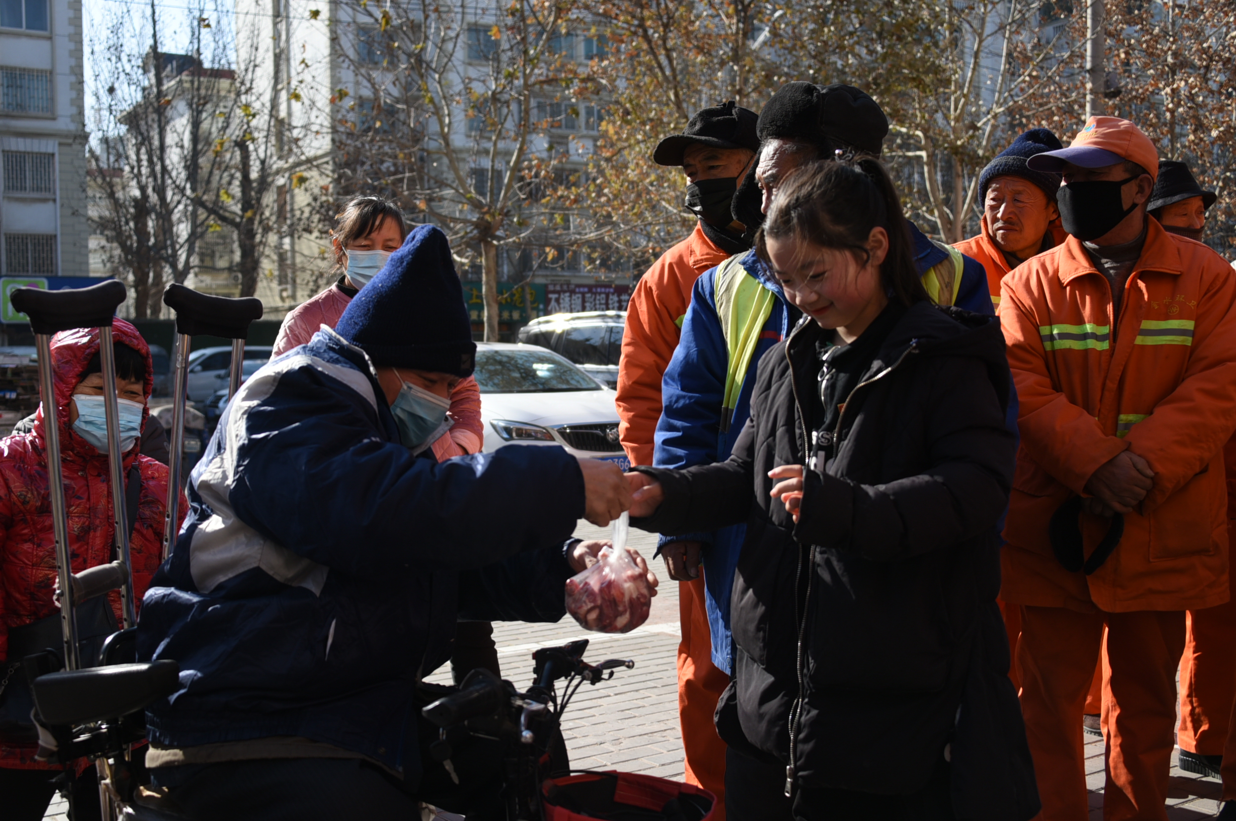2021年1月1日上午11點許,在鄭州國基路守味者羊肉館店門口,數(shù)十多名身穿橘紅色的環(huán)衛(wèi)工人,十余多名殘疾人聚集在店門口等待愛心羊肉的派發(fā)。