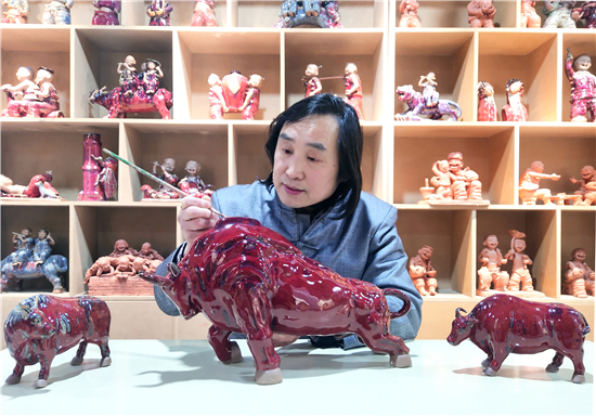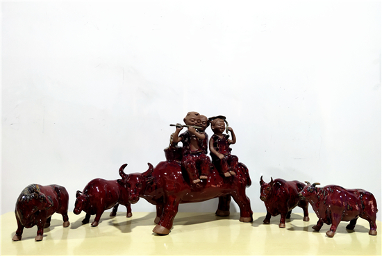 春節(jié)前夕,鄲城泥塑大師張振福歷時多日制作一組鈞瓷泥塑群雕《瑞牛賀新春》。該組作品分為三頭長約90厘米的大牛和若干頭小牛,均為鈞瓷泥塑,采用豫東黃泥和粗獷手法制作,上釉時入窯一色,歷經(jīng)1200多攝氏度高溫燒制后出窯萬變,十分精彩。拓荒牛精神,展現(xiàn)中國人自立自強的志氣;孺子牛精神,體現(xiàn)在創(chuàng)造美好生活的時代課題中;老黃牛精神,貴在“心有大我、至誠報國”的奉獻品格。