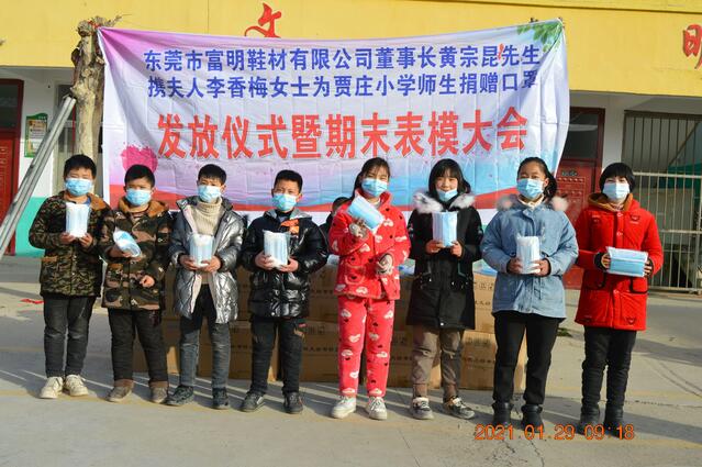 廣東省東莞市富明鞋材有限公司董事長(zhǎng)黃宗昆先生及夫人李香梅女士原籍太康縣馬頭鎮(zhèn)薛廟村,他們得知寒假將至,正值師生、家長(zhǎng)返鄉(xiāng)團(tuán)聚、走親訪友高峰時(shí)節(jié),當(dāng)前疫情防控面臨境外疫情持續(xù)爆發(fā)流行、國(guó)內(nèi)散發(fā)病例頻發(fā)的新情況、新挑戰(zhàn)。為了確保賈莊小學(xué)300多名師生生命安全和身心健康,以及他們近期疫情防控對(duì)口罩的需求,進(jìn)一步增強(qiáng)師生的防控意識(shí),夫妻二人決定為該校捐贈(zèng)3萬(wàn)只一次性醫(yī)用口罩,以實(shí)際行動(dòng)助力該校疫情防控工作。