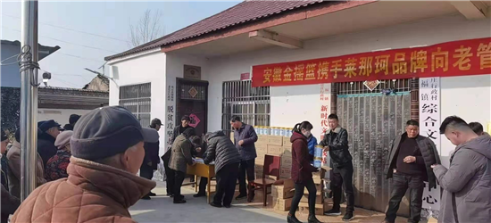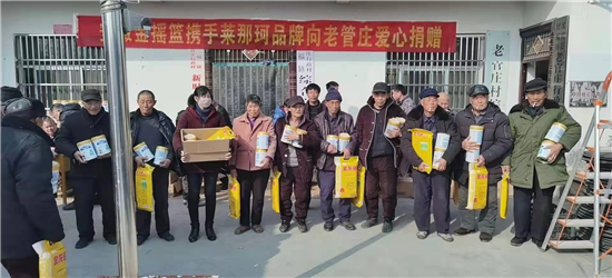 “這是在安徽金搖藍公司工作的老官莊村人王北領(lǐng)、王建立攜手萊那珂奶粉企業(yè)慰問鄉(xiāng)親們吶!”武金英老人一臉幸福。據(jù)悉,這次慰問的對象是老官莊貧困戶、60歲以上老人及困難群眾,慰問捐贈的禮品為奶粉240桶,價值十萬余元。同時,老官莊新當(dāng)選地村黨支部書記王杰華也出資5000元,為村里的60歲以上老人及困難群眾購買大米120袋,用行動為老官莊老人送去節(jié)日的祝福。