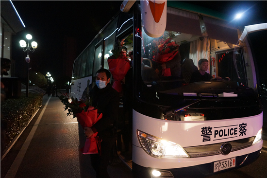 英雄凱旋,鮮花致敬。2月6日夜晚11時(shí)許,寧洛高速項(xiàng)城北收費(fèi)站警燈閃爍、隊(duì)列整齊,項(xiàng)城市公安局在這里隆重舉行儀式,熱烈歡迎 “1.8”專案組民警勝利歸來。副市長(zhǎng)、公安局長(zhǎng)萬東偉,局黨委副書記、副局長(zhǎng)陳重,局黨委委員、政辦室主任衛(wèi)偉,局黨委委員袁啟峰等領(lǐng)導(dǎo)出席儀式,部分民警代表參加了儀式。萬東偉同志代表局黨委對(duì)此案的成功偵破表示熱烈祝賀,真誠(chéng)感謝專案組民警的辛勤付出,并向大家致以崇高的敬意。