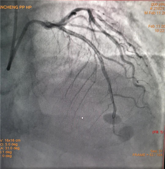 除夕,郭先生無明顯誘因突發(fā)胸痛,120急救人員到達(dá)現(xiàn)場,心電圖顯示:竇性心律完全性束支傳導(dǎo)阻滯。信息立刻發(fā)送到胸痛中心介入微信群中,心內(nèi)科值班醫(yī)生初步診斷為急性廣泛前壁心肌梗死,必須盡快進(jìn)行急診支架治療,開通血管。值班醫(yī)生電話指導(dǎo)院前治療,并立即啟動胸痛綠色通道,24小時(shí)備班的介入治療團(tuán)隊(duì)立即到位,9:30患者被送到導(dǎo)管室行冠脈介入診療,9:40急診PCI手術(shù)隨之開始,冠脈造影檢查提示左前降支閉塞,植入支架,堵塞的血管被順利打通,患者癥狀緩解,手術(shù)非常成功,10:20患者被送往病房進(jìn)一步治療。