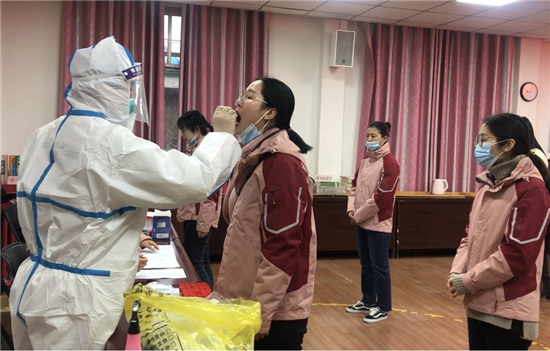 為保證市直幼兒園順利開學,按照市教體局統(tǒng)一安排部署,近日,周口市婦女兒童醫(yī)院核酸檢測組對市直幼兒園全體教職工百余人順利進行了新冠肺炎核酸檢測,檢測結果在校老師全部健康,無異常。圖為市直幼兒園教職工在進行新冠肺炎核酸檢測。