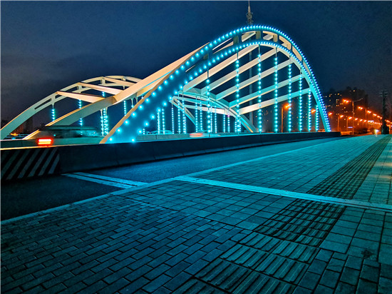 夜幕降臨時(shí),流沙河泰山路橋溫馨的燈光亮了起來,夢幻藍(lán)、蘋果綠、水晶紫、多種顏色變換的橋體顯得熠熠生輝 ,多彩的橋在水面的映襯下流光溢彩。