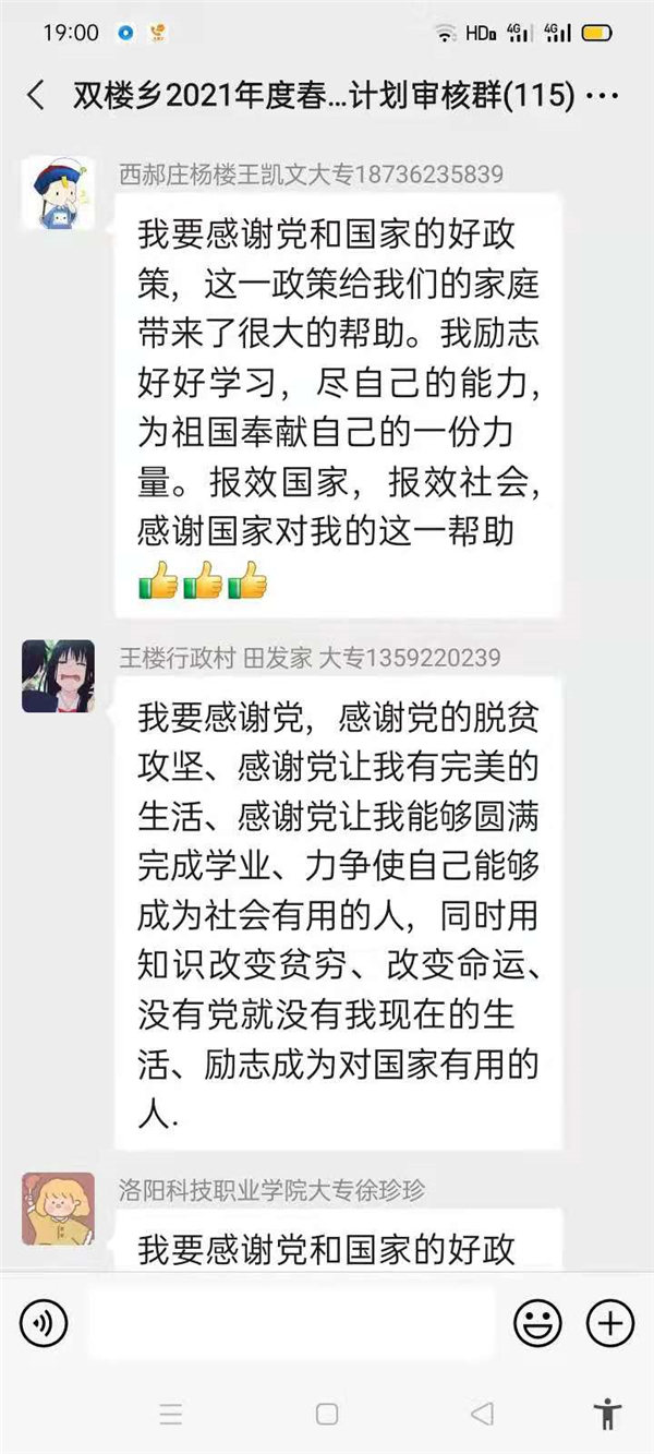 “感謝幫助過我家的所有幫扶人,沒有你們,就沒有我家今天的幸福生活,我們光榮脫貧了,作為貧困家庭中新成長勞動力,我一定珍惜這次來之不易的學(xué)習(xí)機(jī)會,好好學(xué)習(xí)技術(shù),畢業(yè)后回村成為一名技術(shù)帶頭人,來促進(jìn)家鄉(xiāng)產(chǎn)業(yè)的發(fā)展?!编惓强h雙樓鄉(xiāng)孫莊村脫貧學(xué)生張素華在微信群里說。近幾天,鄲城縣雙樓鄉(xiāng)114人的大學(xué)生微信群里可熱鬧了,在鄉(xiāng)黨委政府的引導(dǎo)下,該鄉(xiāng)眾多脫貧后的大學(xué)生通過鄉(xiāng)里建起的微信群,紛紛圍繞“話脫貧、感黨恩、奮進(jìn)新時代”這一主題交流思想,提振斗志。