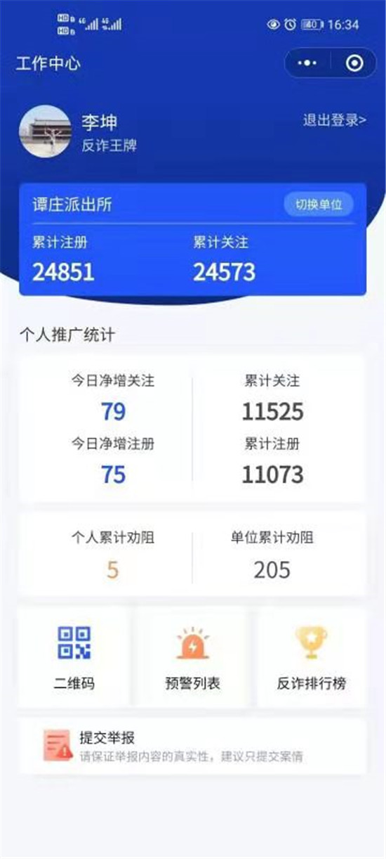 今年2月,商水縣公安局開始利用“金鐘罩”預防電信詐騙活動。在譚莊派出所多年的李坤拿著分配給自己的二維碼,做個小牌子掛到脖子上,開始他的“金鐘罩”宣傳注冊工作。轄區(qū)企事業(yè)單位、村莊、群眾文化廣場、KTV、網(wǎng)吧、超市、洗浴中心等人員密集場所是他必須進的地方,見親戚說、逢朋友講,三句話離不開“金鐘罩”反詐騙宣傳。