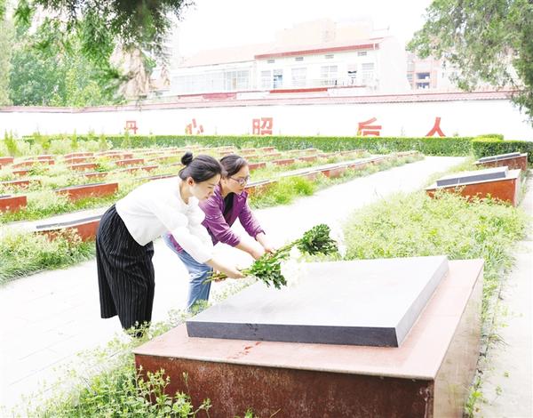 為表達(dá)對烈士的敬仰和懷念,記者和劉波濤烈士后人到鄲城烈士陵園,向劉波濤丁岐烈士合葬墓冢敬獻(xiàn)鮮花(如圖),聆聽劉波濤丁岐的傳奇故事,感受烈士濃濃的愛國情懷(相關(guān)文字報(bào)道及視頻,周口報(bào)業(yè)傳媒集團(tuán)將陸續(xù)推出)。①9