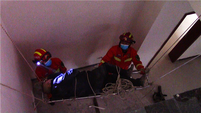 了解情況后,4名消防員立即深入地下室,利用擔架,先將老人保持原有姿勢轉移到擔架上,再用救援繩將老人綁在擔架上加以固定。最后,救援人員將擔架四角分別綁上救援繩,下方人員托扶擔架,上方人員將擔架平穩(wěn)的向上拉。經過近30分鐘緊張救援,成功將被困老人救出,并交由醫(yī)護人員進行下一步處理。②10