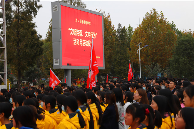 “我是周口交通技師學院的一名學生,從今天起,我要講禮儀、懂禮貌、不說臟話……積極參加“文明用語、文明行為”主題實踐活動,爭做文明學生?!?0月26日,周口交通技師學院全體師生在學院“文明用語、文明行為”活動月動員會上集體宣誓。師生們堅定的目光和錚錚的誓言,展現(xiàn)出青年學子講文明話、辦文明事、做文明人的堅定決心。