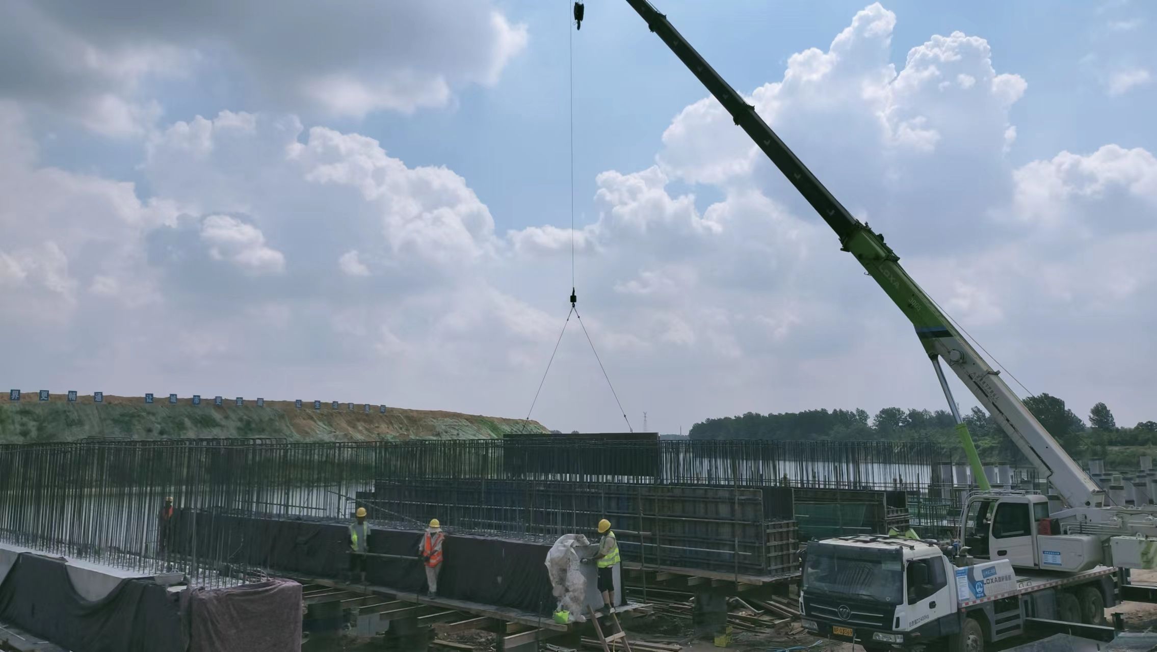 “由于工程進度快,我們要在這兒時刻緊盯住,質(zhì)量上不能出現(xiàn)任何問題。”在周鋼碼頭建設(shè)工地上,只見一根根粗壯的停泊位專用水泥柱整齊地排列在沙潁河岸邊,高大的塔吊正在向上面吊裝預(yù)制板,工人們在高大的腳手架上工作著,一個新型專用碼頭已見雛形。馬工程師和幾名工程技術(shù)人員在作業(yè)區(qū)不停地巡視著,巡視間隙,他對記者說。