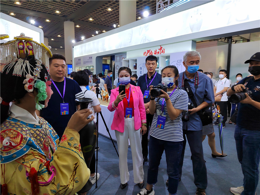 中國非物質(zhì)文化遺產(chǎn)博覽會,每兩年舉辦一屆,是非遺領(lǐng)域的全國性重要品牌活動,已成為展示非遺保護(hù)成果、宣傳非遺保護(hù)理念、引領(lǐng)非遺保護(hù)工作的重要平臺。本屆非物質(zhì)文化遺產(chǎn)博覽會為期5天,河南省有16個(gè)非遺項(xiàng)目、4個(gè)非遺美食企業(yè)參展,布置在文化底蘊(yùn)深厚的“行走河南·讀懂中國”展區(qū)?;搓柡谔铡⒀錾夭侍?、唐三彩、魯山窯、汝瓷、鈞瓷、登封窯、當(dāng)陽峪絞胎瓷、澄泥硯、??h泥咕咕燒制技藝在展廳一一亮相?;搓柡谔諢萍妓囀〖墏鞒腥藦堓x攜帶的部分作品以大氣、精美的文化底蘊(yùn)深深吸引著人們觀賞,各派非遺戲曲傳人也紛紛捧起他的黑陶作品展示中原古老的黑陶藝術(shù)文化。②15