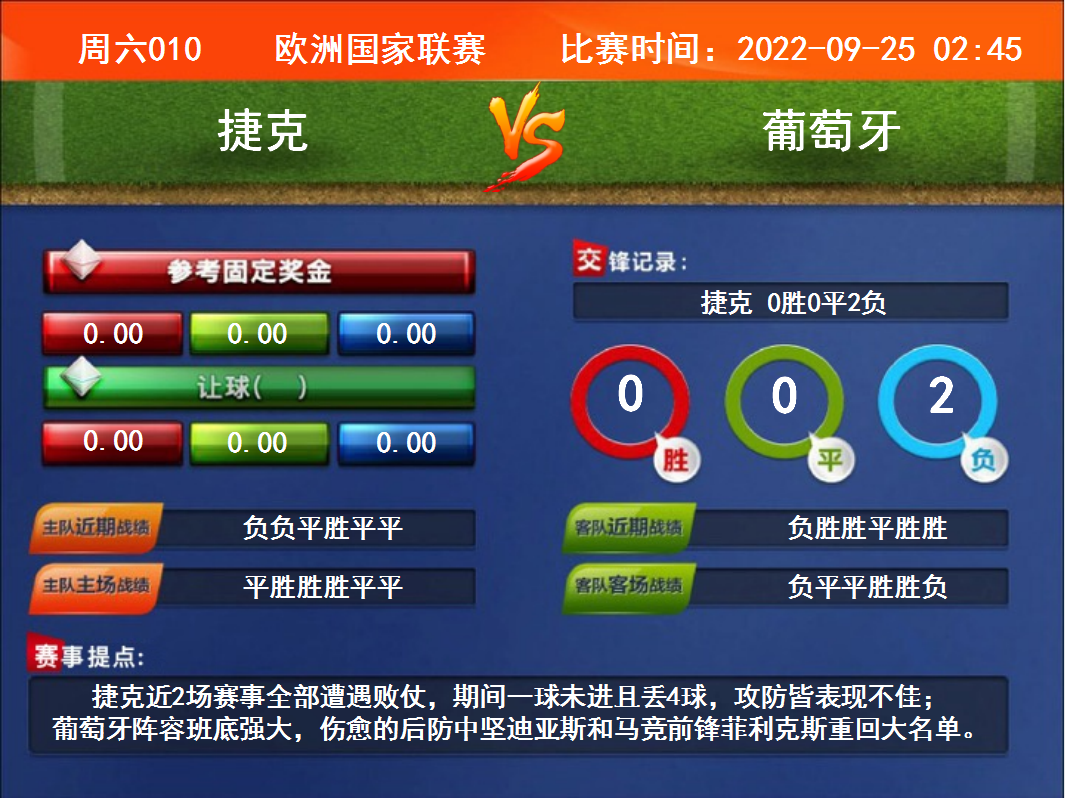 比賽時間:2022-09-25 02:45賽事提點:捷克近2場賽事全部遭遇敗仗,期間一球未進(jìn)且丟4球,攻防皆表現(xiàn)不佳;葡萄牙陣容班底強大,傷愈的后防中堅迪亞斯和馬競前鋒菲利克斯重回大名單。