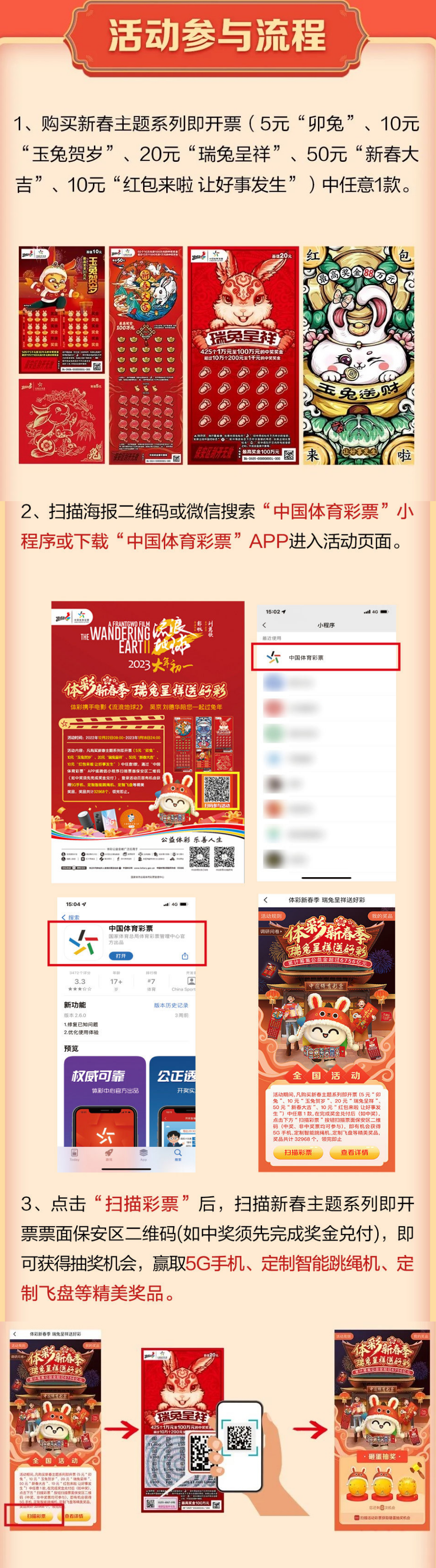 2.“體彩新春季”全國(guó)促銷活動(dòng)細(xì)則詳見(jiàn)“中國(guó)體育彩票”微信小程序或“中國(guó)體育彩票”APP活動(dòng)頁(yè)面,或登錄中國(guó)體彩網(wǎng)查詢相關(guān)信息。