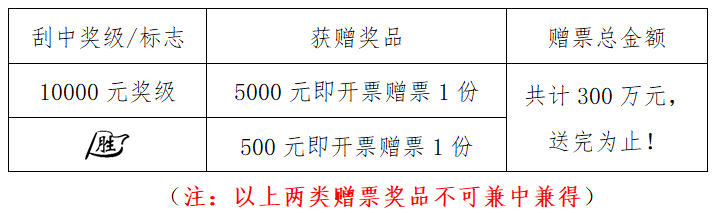 活動(dòng)期間,購(gòu)彩者在河南省范圍內(nèi)任一體彩銷售實(shí)體店購(gòu)買指定活動(dòng)票種,若單張彩票刮中符合獎(jiǎng)勵(lì)條件的獎(jiǎng)級(jí)或標(biāo)志,經(jīng)實(shí)體店終端兌獎(jiǎng)設(shè)備成功完成獎(jiǎng)金兌付及促銷兌獎(jiǎng)掃描后,即可獲得即開(kāi)票贈(zèng)票獎(jiǎng)品一份。總額有限,送完為止,詳見(jiàn)下表: