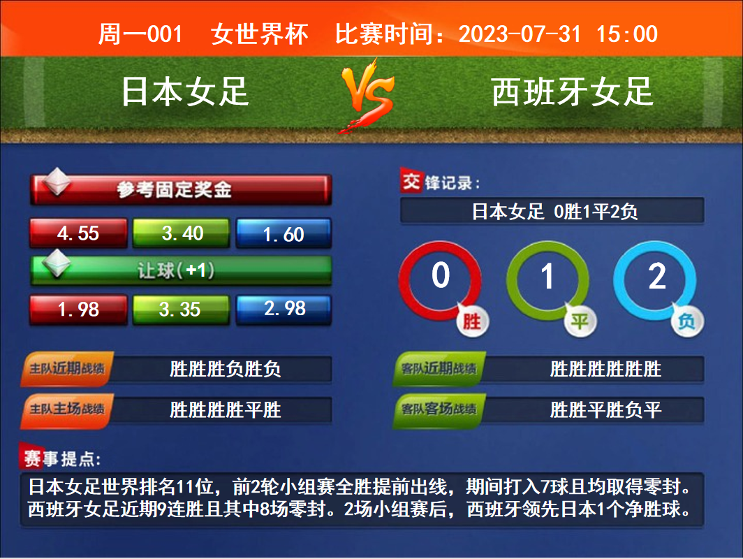 比賽時間:2023-07-31 15:00賽事提點:日本女足世界排名11位,前2輪小組賽全勝提前出線,期間打入7球且均取得零封。西班牙女足近期9連勝且其中8場零封。2場小組賽后,西班牙領先日本1個凈勝球。