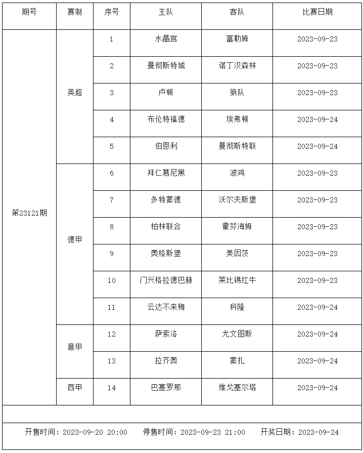 傳統(tǒng)足彩第23121期的賽事主要由英超、德甲、意甲和西甲組成。五大聯(lián)賽激戰(zhàn)正酣,豪門球隊(duì)都參加了周中的歐戰(zhàn),一周雙賽對于球隊(duì)體能有著不小的影響。其中曼城、曼聯(lián)、拜仁和巴薩等豪門都入選了本期足彩,他們能否全取三分我們一起來分析。