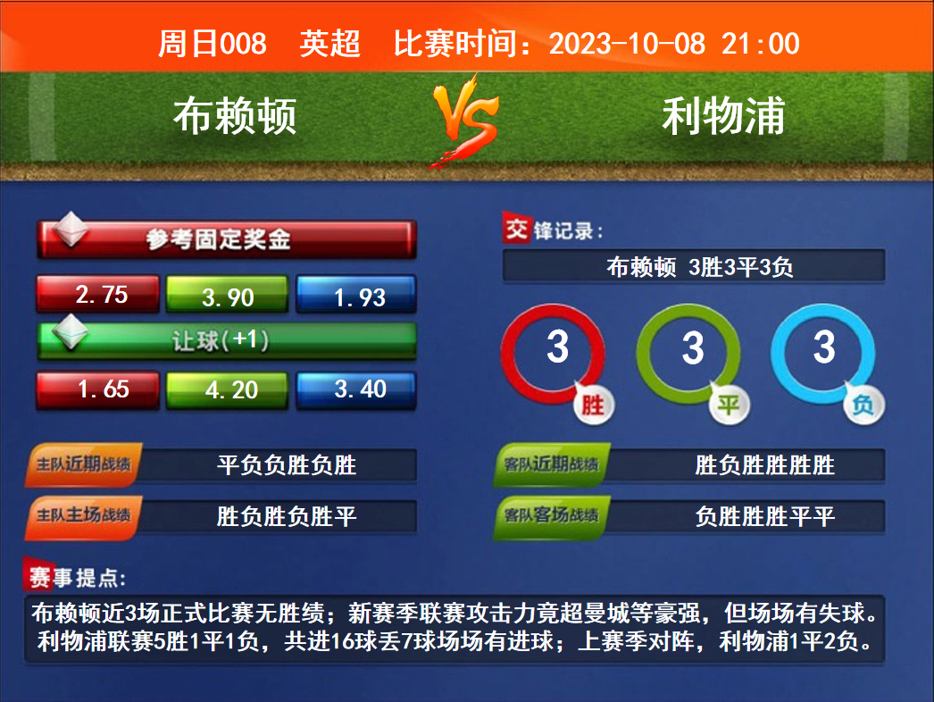 比賽時間:2023-10-08 21:00賽事提點(diǎn):布賴頓近3場正式比賽無勝績;新賽季聯(lián)賽攻擊力竟超曼城等豪強(qiáng),但場場有失球。利物浦聯(lián)賽5勝1平1負(fù),共進(jìn)16球丟7球場場有進(jìn)球;上賽季對陣,利物浦1平2負(fù)。