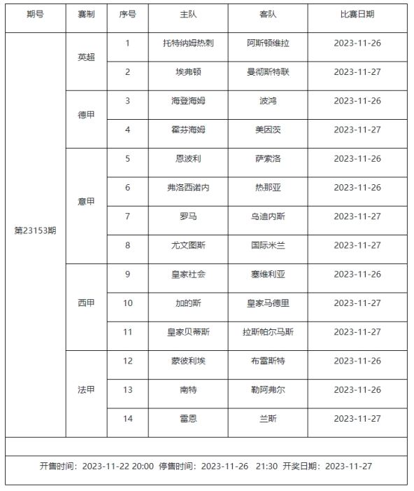 足球彩票勝負游戲(14場和任選9場)第23153期賽程:
