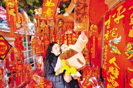 新春將至,年味漸濃。2月12日,在掛滿福字與春聯(lián)的商鋪里,市民懷抱著孩子認真挑選,指尖拂過紅彤彤的春聯(lián)紙,目光里滿是對新年的期許。