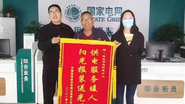 近日,在國網(wǎng)周口供電公司陽光報(bào)裝中心,中國鐵塔股份有限公司周口分公司業(yè)務(wù)經(jīng)理朱義嶺一邊將印有“供電服務(wù)暖人心 陽光報(bào)裝送光明”的錦旗遞給供電工作人員,一邊感謝該公司對鐵塔基站建設(shè)提供的支持。