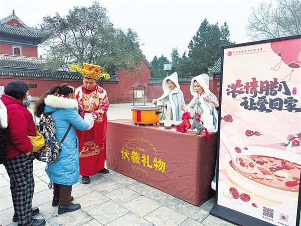 1月26日,游客排隊(duì)領(lǐng)取臘八粥。當(dāng)日,農(nóng)歷臘月初八,一場(chǎng)以“財(cái)神賜?!げ排钪唷す灿槿稹睘橹黝}的活動(dòng)在太昊陵景區(qū)太極門廣場(chǎng)精彩上演,為游客們帶來(lái)了一場(chǎng)沉浸式文化盛宴。