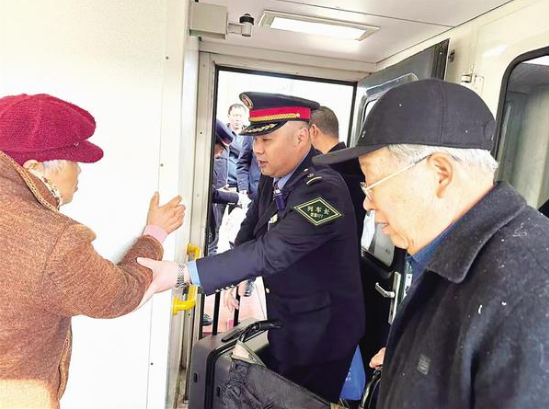 11月22日,由周口開往上海的K1505次列車??宽?xiàng)城站時(shí),列車長(zhǎng)潘玉龍?jiān)谡九_(tái)發(fā)現(xiàn)一位乘坐輪椅的旅客李女士,便主動(dòng)上前提供幫助。