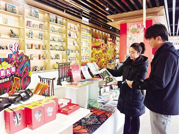 12月18日,在太昊伏羲陵文化旅游區(qū)旅游產(chǎn)品展廳,游客在欣賞非遺手工產(chǎn)品。近年來(lái),太昊伏羲始祖旅游區(qū)運(yùn)營(yíng)管理有限公司為豐富游客體驗(yàn),聚焦非遺手工、潮玩手辦等主題,開(kāi)發(fā)了近百個(gè)旅游新產(chǎn)品,以滿足游客多元化需求。