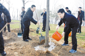 3月12日,皇甫立新等在植樹點植樹。當日,沈丘縣四個班子領導來到縣城東環(huán)路綠化帶植樹點,與當?shù)厝罕娨黄饟]鍬鏟土,參加義務植樹活動。(記者 韋偉 通訊員 艾長青)