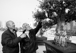 兩名老人在市體育場“市第四屆花卉盆景藝術(shù)展”上駐足觀看。(記者 沈湛 攝)