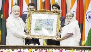 印度和孟加拉國簽署多項文件加強合作 6月6日,在孟加拉國達(dá)卡舉行的新聞發(fā)布會上,孟加拉國總理哈西娜(右)向印度總理莫迪贈送電站項目效果圖。孟加拉國總理哈西娜6日與正在孟加拉國訪問的印度總理莫迪舉行會談,兩國當(dāng)天簽署多項文件加強合作。新華社發(fā)