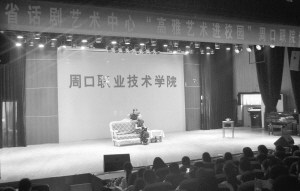 6月9日下午,由河南省教育廳、文化廳、財政廳主辦的2015年“高雅藝術進校園”——省話劇藝術中心專場演出在周口職業(yè)技術學院礪德廳舉行。激情的舞臺對白、絢麗的歌舞場景,話劇藝術中心的演員們聯(lián)袂為800余名師生獻上了一場視聽盛宴。(孫先鋒 攝)
