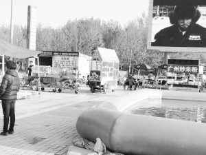 4月8日18時許,記者在現(xiàn)場看到,廣場的中央噴泉東側(cè)擺了許多攤點,有的攤點甚至把桌椅擺到了人行道上(如圖)。在廣場東側(cè)的出入口處,一些賣飯的商販已經(jīng)將桌椅擺放整齊,不寬的道路被占去近一半。