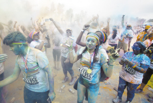 當(dāng)?shù)貢r間6月13日,在美國洛杉磯,約萬名跑步愛好者在洛杉磯道奇球場外參加“彩色跑”活動?!安噬堋笔且豁棅蕵放懿巾椖?,全程為5公里,每公里設(shè)置一個彩色站,當(dāng)參與者跑至彩色站時,由志愿者向參與者拋灑彩色粉末。與傳統(tǒng)跑步競速相比,“彩色跑”活動雖然沒有贏家或獎品,但強調(diào)“參與、娛樂和色彩”的重要性。