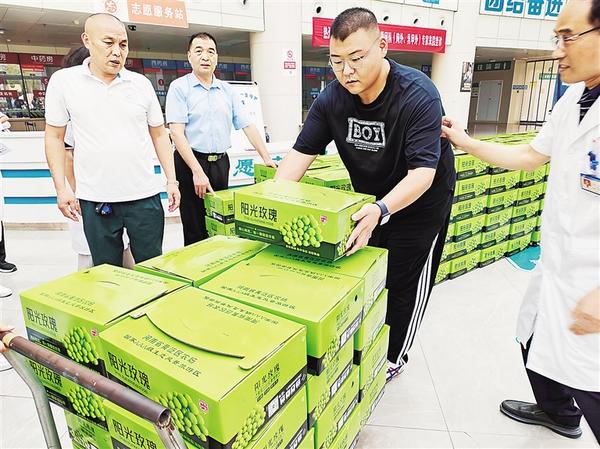 9月7日下午,來自黃泛區(qū)農(nóng)場的時先生(右二)將270箱自家農(nóng)場種植的葡萄捐贈給周口港區(qū)醫(yī)院,與醫(yī)護(hù)人員一起分享雙重喜悅:自家果園的豐收和他個人的身體康復(fù)。