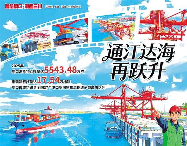 2025 年,周口港交出亮眼答卷:貨物吞吐量 5543.48 萬噸、集裝箱吞吐量 17.54 萬標(biāo)箱,兩項(xiàng)數(shù)據(jù)雙雙創(chuàng)下歷史紀(jì)錄,躋身全國 37 個(gè)港口型國家物流樞紐承載城市。